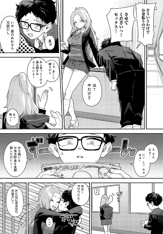 同じクラスのデカパイギャルJK・るるかさんは「お金を払えばヤらせてくれる」らしい。噂を知ったオタクくんは、るるかさんに童貞を卒業させてほしいと頼み込み、理科準備室でSEXしてもらうことに。童貞のオタクくんを舐めていたるるかさんは「あーしは気にせず好きに動いていいよ〜」とビッチの余裕を見せるものの、この二人身体の相性が抜群らしくて…? 予想外に感じまくりのるるかさんに「本当に相性最高なのか確かめないとね〜」とラブホテルまで連れて行かれ、オタクくんの長くてエロい童貞卒業エッチがはじまる♪ 甘くて可愛いエロの新星・牛蟹合戦先生が描く、淫乱ギャルJKをオタクくんがチ○コでイかせまくる濃密な童貞卒業S…