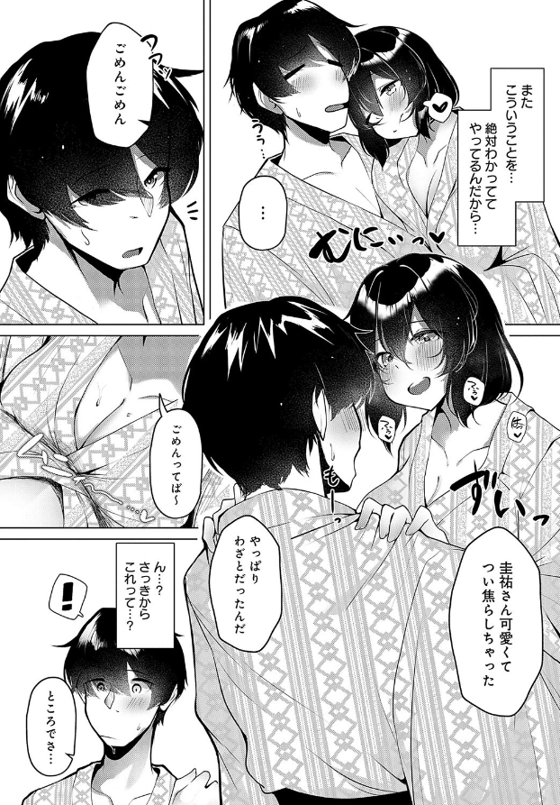 主人公・圭祐は、妻・優香と夫婦水入らずの温泉旅行にやって来た。貸切風呂でたっぷりキスをしてエッチな雰囲気になる2人だったが「続きはお布団でしようね?」と優香に止められてしまう。最近の優香はこうやってわざと煽っては焦らしてくるのだ。そして悶々としながらも温泉から上がり部屋に戻ったところで、優香が下着を一切付けずに風呂から戻っていたことが判明!? 度を越したイタズラに、さすがの圭祐も我慢の限界!? 激しい手マンや露天風呂での立ちバックで、優香がイッてもイッても止めないお仕置きSEXがはじまる!! 積極女子マイスター・けーしむ先生が贈る、淫乱な妻がイッても止めない反省SEX!!