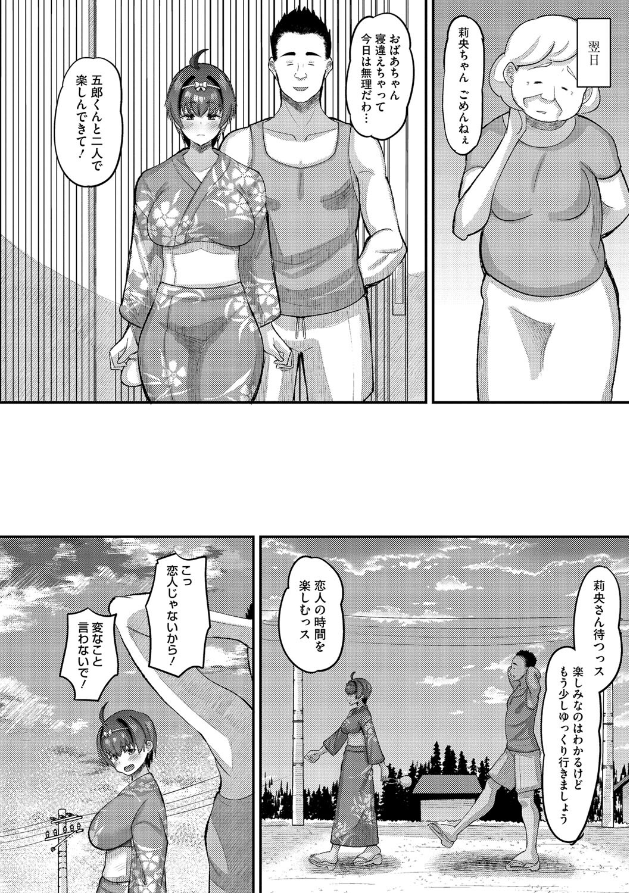 湖山 莉央は夏休みを利用して、久々に大好きなおばあちゃんに会いにいなかの家にやってきたら、そこには見知らぬ男の子がいた。話を聞くと近所に住んでいる五郎くんという男の子で、おじいちゃんが亡くなってから、なにかとおばあちゃんのお世話をしてくれていたという。莉央は一気に五郎くんに信頼を寄せる。 三人で晩ご飯を食べた後、莉央はおばあちゃんにおじいちゃんとの馴れ初めを教えてとねだると、おばあちゃんが女学生の頃、同じクラスの男の人とお付き合いを始めたら、ある日、寝ているおばあちゃんにおじいちゃんが夜●いをかけてきたと(この村では昔から夜●いで孕ませた女を嫁にするという風習があったため)。おばあちゃんの凄い…