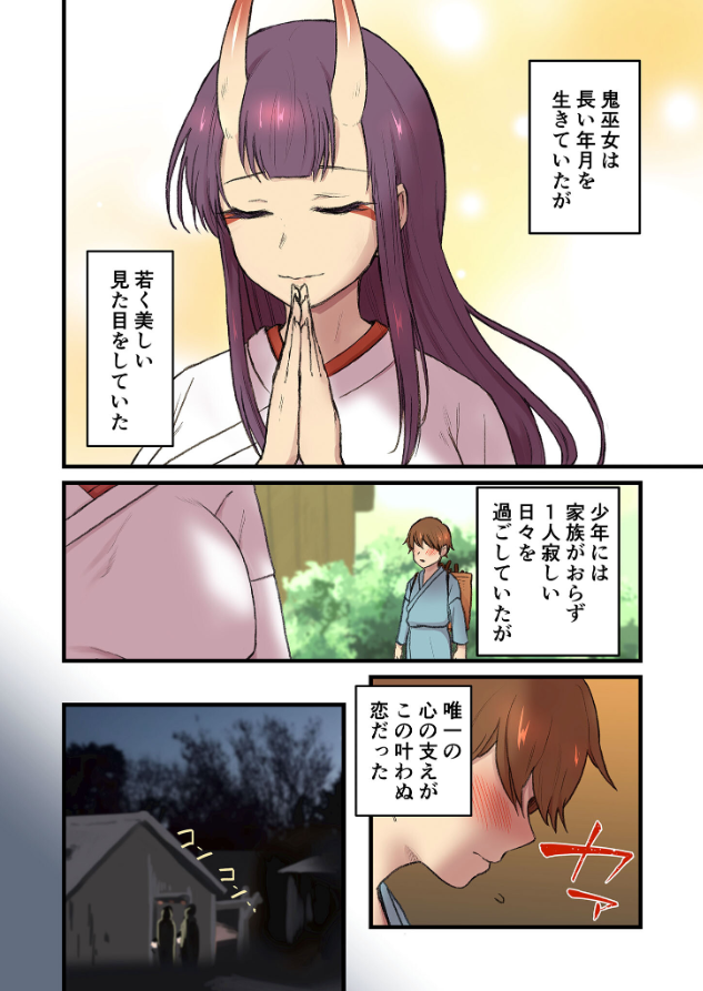 遥か昔、まだ人間と妖怪が共に暮らしていた時代。 とある村に一人の男子がいた。 その村には大きな神社があり、 彼はそこの巫女をしている鬼に心惹かれていた。 鬼巫女は長い年月を生きていたが、若く美しい見た目をしていた。 彼には家族がおらず、1人寂しい日々を過ごしていたが、 唯一の心の支えがこの叶わぬ恋だった。 人間と異種族の壁、身分の差に悶々とした日々を過ごしていた。 この村では一つの風習があった。 それは、生贄の儀式。 50年に一度、若い男を鬼巫女に捧げる。 選ばれた男は干からびてしまう。 こうやって村は繁栄を約束されてきた。 そして、今年は彼に白羽の矢が立ったのだった。 鬼巫女の目の…