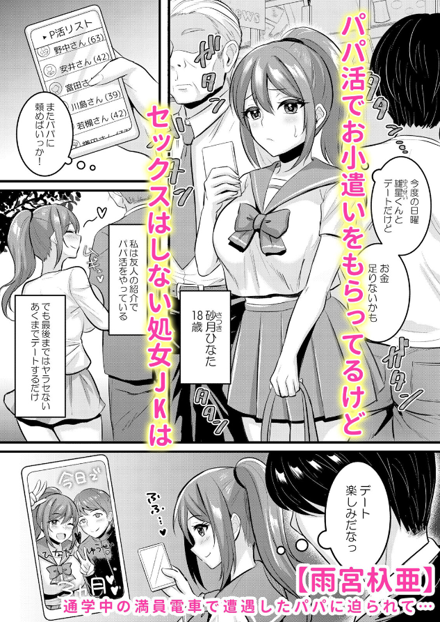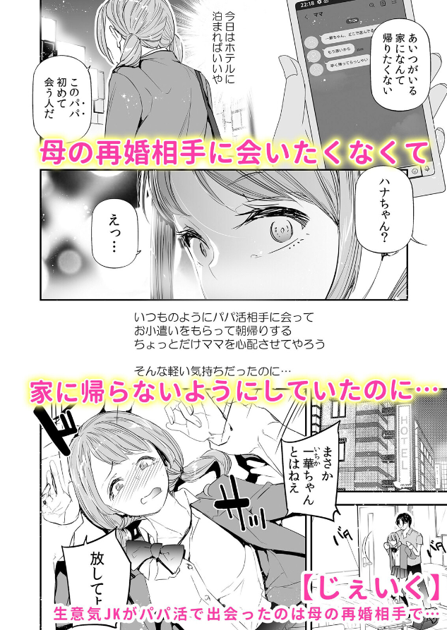 「もっとパパと仲良くしようか、一華ちゃん」母親の再婚相手を毛嫌いして夜の街を遊び歩くJKの一華。パパ活の約束を取り付けた相手と待ち合わせるが、そこに現れたのは敬遠していた義父だった。強引に制服を剥ぎ取られての愛撫に、母親を堕とした凶悪なチ●ポで今まで知らなかった快楽を知らされる。「嫌なはずなのに…腰が止まんないよぉっ!」次第に自分から腰を使って奉仕するように仕込まれていく一華の行く末は……――他「婚約者の父親と愛人関係だった元ギャル」「担任教師を誘惑するビッチ娘」「路上で推し活費用を稼ぐ立ちんぼ女子」等、大人のセックスで分からせ堕とされたパパ活女子たちを描くお仕置きアンソロジー!