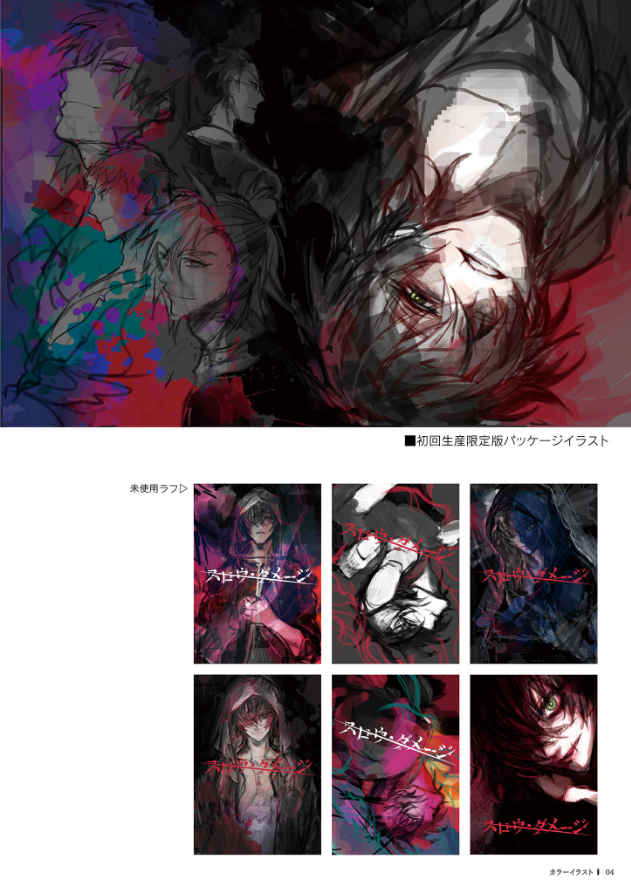 『咎狗の血』で使用された版権イラストや小物デザインに加えて、ラフ画集や未公開のボツ原画、おまけイラストなども収録。 それぞれのイラストには、原画担当’たたなかな’が開発当時を振り返り、その頃の思い出などを交えたコメントなども掲載されています。 さらにはシナリオ担当’淵井鏑’の書き下ろしSSも収録された、カラー16ページを含む全48ページ構成の『咎狗の血』本です。 書き下ろしSSのページ他、文字が見えにくい箇所がございます。あらかじめご了承ください。