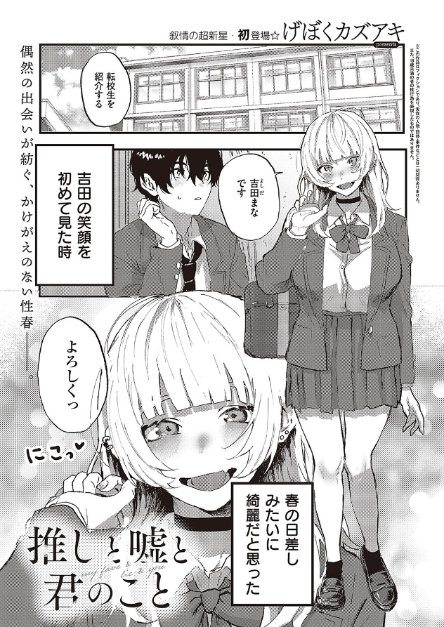 推しと嘘と君のこと(単話)By eromangaking / 10月 1, 2024 著者: げぼくカズアキ オタバレから始まった転校生まなとの日々。 俺にとって美しい思い出となるはずが一転、 彼女の良くない噂が校内に流れ始める。 信じたくない俺は彼女に真偽を問いただすのだが、 彼女はおもむろに俺の股間に手を伸ばしてきて──。 叙情の超新星・げぼくカズアキ先生が贈るかけがえのない性春。