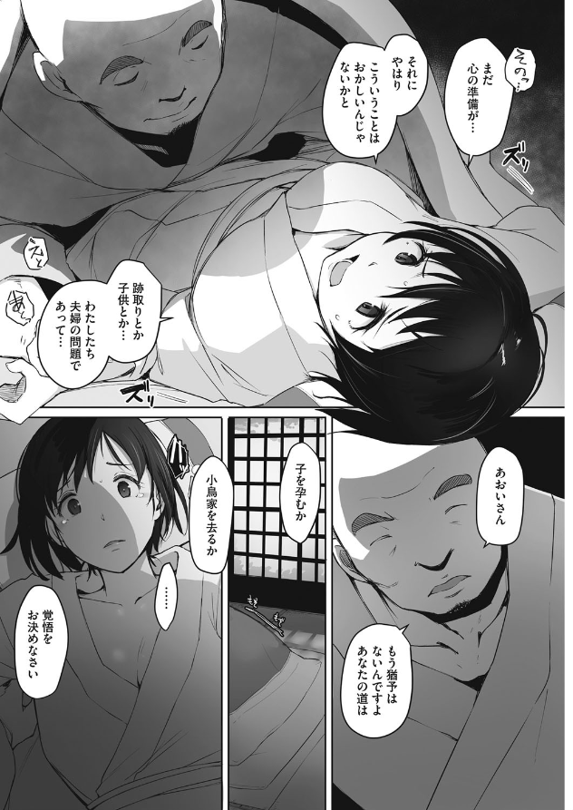 2年も妊娠の兆しのない嫁、あおいはこのままだと小鳥家から去らねばならない。しばらく本家の鳳様の邸宅で様子をみることになった。熱く充実した夜伽の連続にて、あおいは晴れて赤子を授かるのだった。小鳥家の嫁として暮らす充実の思いが溢れる。