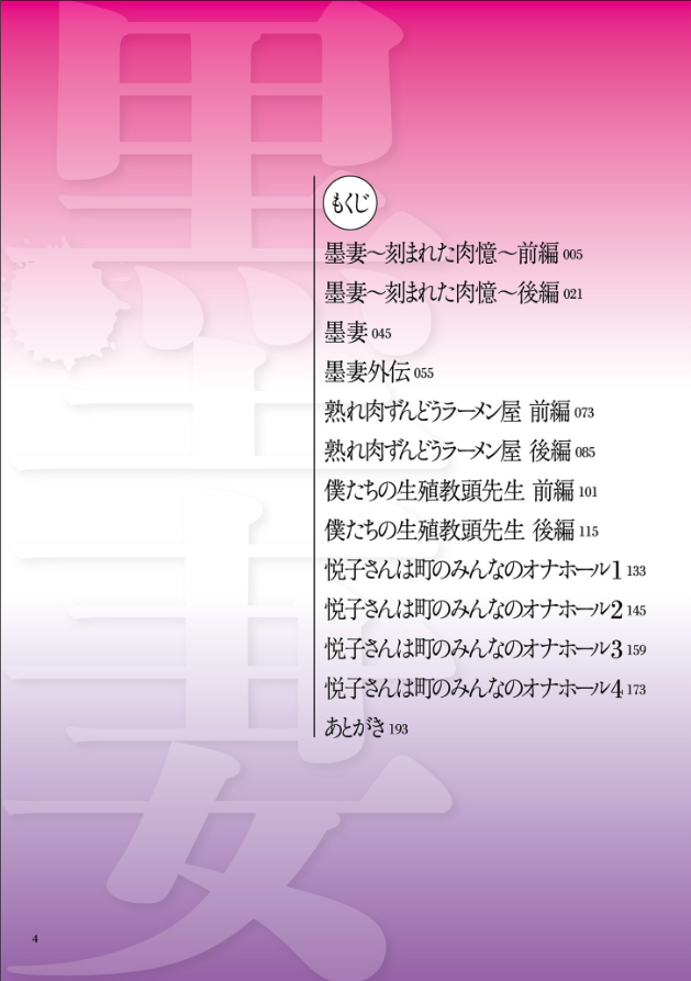 悪漢に入れ墨を施され肉奴●にされた人妻たち、借金のカタに薄汚いオヤジたちに奉仕するラーメン屋のおばさん、校内での恥ずかしい姿を生徒に撮られ言いなりになった女教頭、男たちの暴走する性欲から町の女性を守る謎の美熟女……。 特異な表現で根強いファンを持つ奇才が人妻・熟女専門ウェブマガジン『comicクリベロン DUMA』で描いた熟女が、ここに集結! 全編192ページオールカラー!! ※FANZA限定描き下ろし漫画付き!