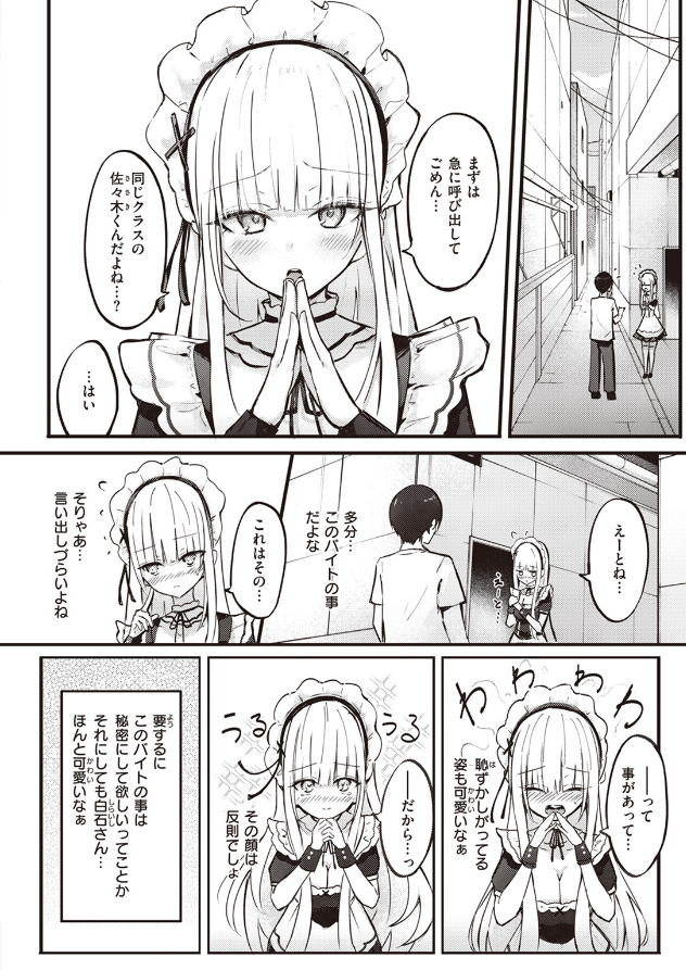 「えっちなことしたら…言わないでくれる……?」 学力トップでクラス1の美少女・白石凪(しらいしなぎ)。 そんな彼女に恋する同じクラスのメガネ男子・佐々木(ささき)は、白石さんがこっそりメイドカフェで働いていることを知ってしまう。 秘密にして欲しい白石さんは、佐々木の肉棒を唐突にご奉仕し始め、そのまま彼女の可愛いおクチに口内射精! 白石さんと続きをヤることを約束して、バイト後の彼女とラブホに直行……♪ 憧れの女のコと≪ひみつ≫を共有しあう、ハートのドキドキ止まらないイチャラブセックスがここに! キュートなヒロインを描くことに定評のある、新進気鋭が『COMICゼロス』で堂々デビュー!!