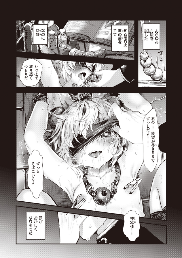 夢侵すルクスリア(単話)By eromangaking / 10月 5, 2024 著者: KOMOTA ある雨の夜のこと、ひとりの少女が教会にやってきた。 顔立ちは随分と若く、濡れたマントを脱ぐとわずかに膨らんだ胸が服の上からうっすらと透けて見えていた……。 そして、少女はお礼をこめて優しく迎え入れてくれた神父の頬に、そっと唇を寄せた。 ――その日からだった。目を覆いたくなるような淫らな夢を見るようになったのは……。