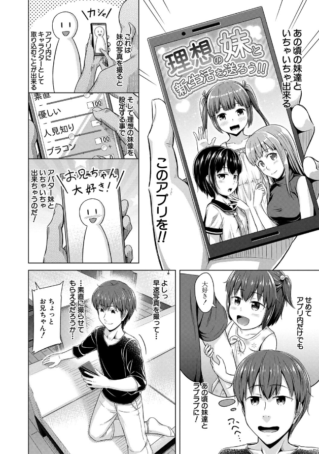 【Fanza専用特典あり】 ■内容紹介■ 性格も肉体も改造自在!! 塩対応の妹たちを兄依存のド淫乱にしちゃえ!! 俺は妹たちとイチャイチャするアプリゲームを制作!! このアプリは撮影した妹をアバターにして遊べるのだ!! だが何故かは分らんがアバター登録したキャラ設定が、 現実の妹たちに反映されてしまった!! かくして俺は、お兄ちゃん好きのド淫乱となった妹たちと、 セックス三昧の日々を送る事になる!! 妹エロの専門家OgataAzが描く妹限定催●アプリ!! 美麗な作画と丁寧なエロシーンで今回も【実用性】マックス!! 小生意気な妹たちを従順なメスにジョブチェンジだ!! 本誌掲載分に加え、描…