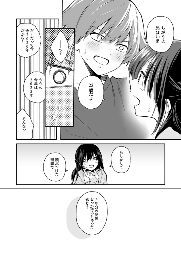 「昴っ…!大丈夫…!?」 目を開けると、ずっと片思いをしていた’伊原さん’が目の前に 彼女はなぜか涙ぐんだ目で抱きついてくる 「てか、ここどこ…?」 彼女は僕の様子を不審に思ったのか、名前や誕生日を立て続けに聞いてくる そして年齢は?と聞かれ、17歳と答えたところで彼女が固まる 「ちがうよ、昴はいま22歳だよ」 「…… へ?」 どうやら僕は頭をぶつけた衝撃で5年分の記憶を失ってしまったらしい そしてなんと、僕は憧れの伊原さんと付き合っている…らしい にわかには信じ難かったが 彼女は付き合った経緯や2人のデートの思い出を教えてくれた 本当に伊原さんと付き合っているんだな 彼女との…
