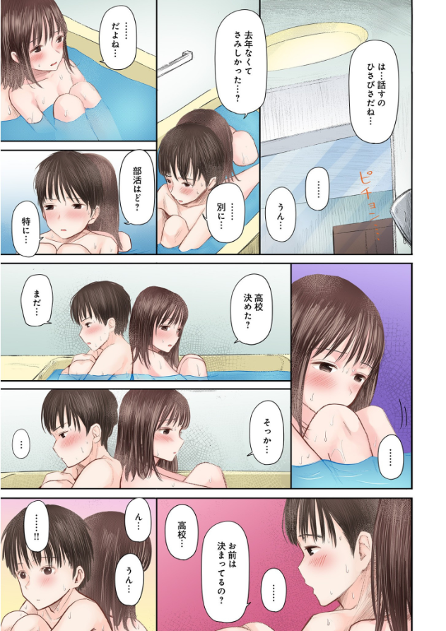 【上田家&今井家合同お泊り会のルール】 1.子供は一緒にお風呂に入って、一緒に寝る 2.大人は朝まで飲む 3.酒が飲めないうちは子供 幼なじみの真司とヒナは半ば強引に一緒にお風呂に入ることに…。 緊張してのぼせてしまった真司が目を覚ますとそこには自らを慰めるヒナの姿が。 戸惑いながらも互いに成長したカラダを見つめあう二人は 照れながらも一緒にお風呂に入った後、二人は寝室で向き合っていた。 大人っぽく成長したヒナに緊張してしまっていた真司は、自分のことを嫌いになってしまったんじゃないかと心配していたヒナにゆっくりと好意を伝える。 ぎこちないキスを交わしながら、互いの気持ちを確認する二人。 緊…
