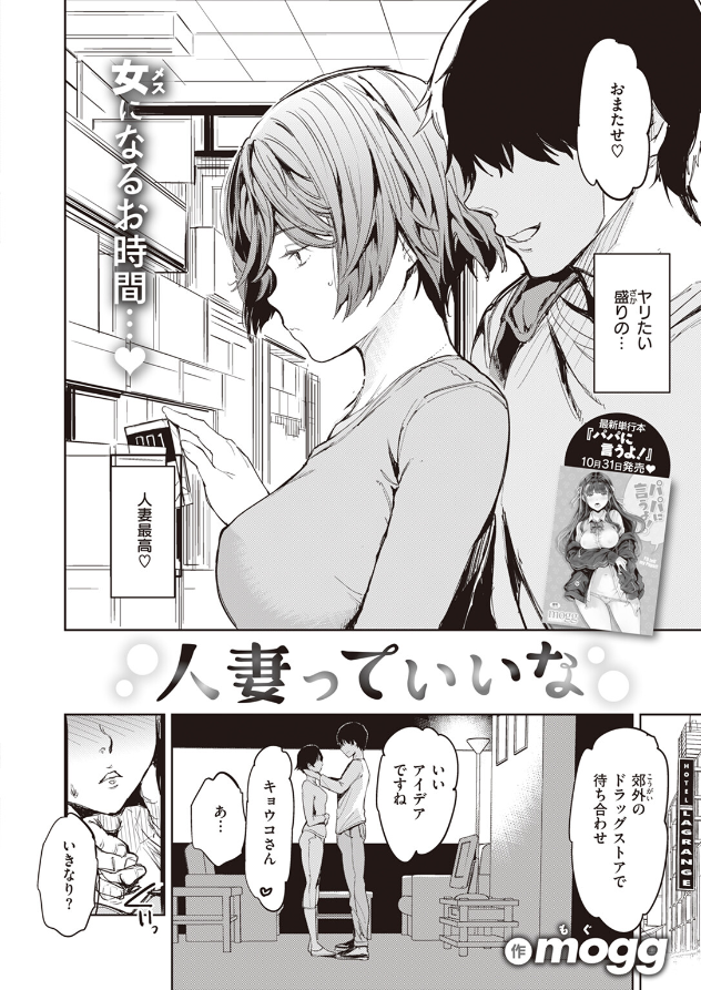 人妻っていいな(単話)By eromangaking / 11月 7, 2024 著者: mogg (やっぱりスゴイ…人妻の性欲……) 大学生・佐渡(さど)の好みのタイプは人妻。 面倒くさい会話も食事も無く、ヤリたい盛りなところが最高♪ 今日も郊外のドラッグストアで若妻と待ち合わせて、そのままラブホへ。 旦那とは週1で…… な愛され妻に、上品な顔してド淫乱な有閑ママ、更には結婚したばかりの元カノとも……!? 遊び妻たちとの濃密SEXライフをご堪能ください♪