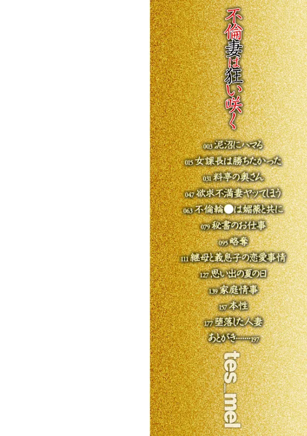 濃厚作画で好評の作家『tes_mel』が放つ、 爆乳人妻奥さんコミックス第2弾! 爆乳人妻の堕ちる瞬間を完全描写! 荒ぶる快楽に翻弄され、満たせぬ欲望に身を焦がす人妻の妖艶さ!! 白く柔らかく熟れた肌 こぼれる巨乳! 男の隅々まで知り尽くした癒しと焦らし!! 美しい人妻に翻弄され、その肉を粘膜を味わい尽くす喜び! 魅惑の瞳に目が吸い付いて離れない!! その香りに包まれ、その唇に含まれたら…!? 【泥沼にハマる】 【女課長は勝ちたかった】 【料亭の奥さん】 【欲求不満妻ヤッてしまう】 【不倫・・は媚・と共に】 【秘書のお仕事】 【略奪】 【継母と義息子の恋愛事情】 【思い出の夏の日】 …