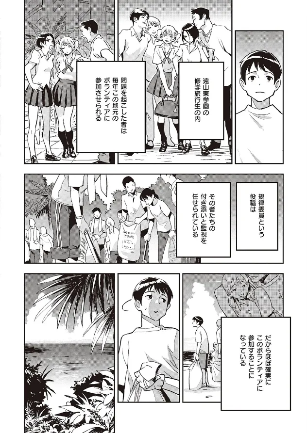 修学旅行に訪れた規律委員の主人公。 問題児はボランティアをさせられる行事があり、 サボる理乃と遼を咎めるものの取り付く島もない様子。 そんな中、主人公は現地の人と「秘密の交流」が行われる場に 迷い込んでしまう。 そしてそこに理乃と遼も入って来てしまい──。 唯一無二の猥談作家・三巷文先生が贈る、ひと夏の現地交流。
