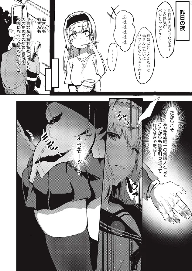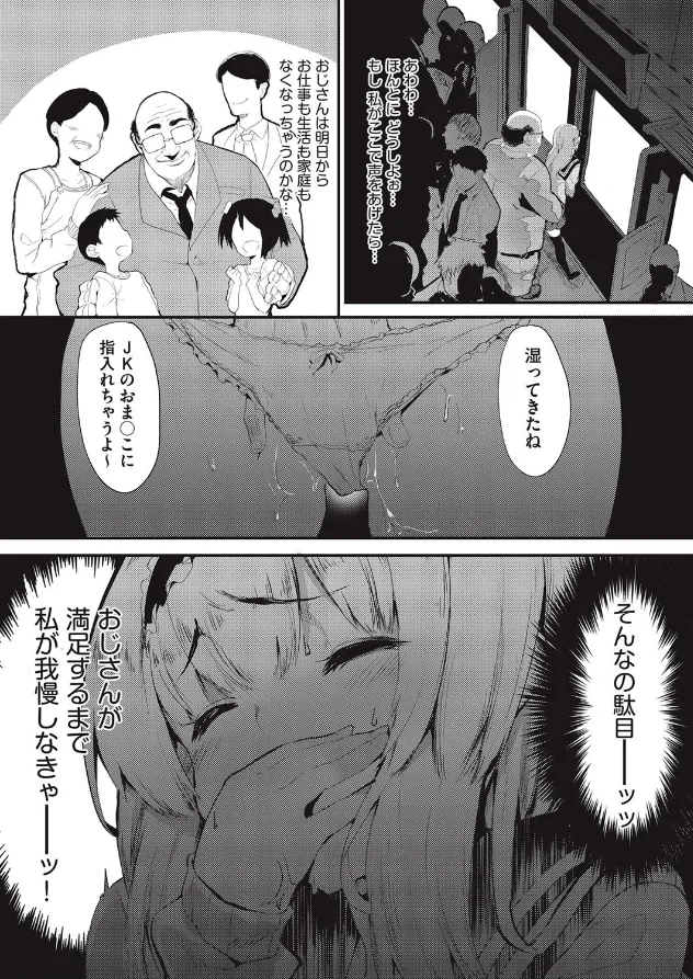 母と姉の浮気話を聞いた幸代は、私利私欲でなく人のため愛のために動ける人間になろうと思わないのかと考え、家族唯一の常識人として皆を引っ張っていかなきゃと決意したその時―。痴●!!?…もし私がここで声をあげたら…おじさんは明日からお仕事も生活も家庭もなくなってしまうかも…!!?そう思った幸代はおじさんが満足するまで私が我慢しなければと、されるがままに…「やだ…おじさんの手つき…けっこう…」。その厭らしい手つきに感じてしまった幸代のま○こはローションのようにもう濡れ濡れ…。そして先程の決意から、幸代はおじさんを更生させるためにとホテルまで付き合ってしまう…!!?