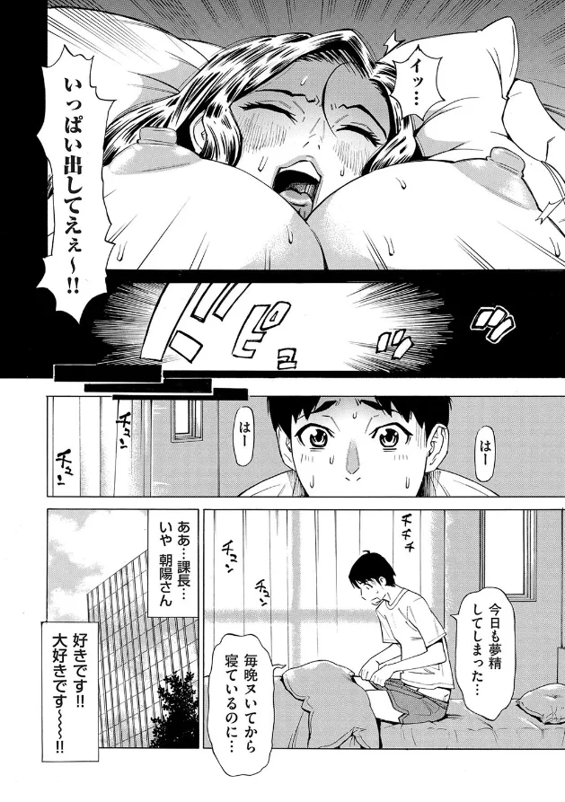 僕は間中健吾、24歳のサラリーマンです。 いま配属されている部署の課長、福良さんは クールで知的で、笑顔が優しくて そのうえおっぱいも大きいのです!! 僕は課長のことが大好きになってしまい、 いつも課長のことばかり考えているのです。 そんな仕事終わりのある夜、 僕が仕事でミスをしてバーで ヤケ酒を飲んでいると、 どういう訳か僕の横に課長が座ってきたのです。 しかも仕事のときとはぜんぜん違うセクシーな服で! そして、僕が胸の谷間に気を取られていると……。