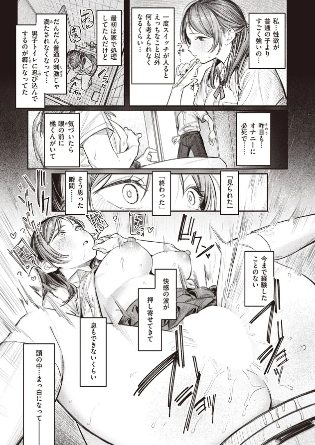 「小野寺さんのオナニーを見てあげるだけ それだけのつもりだった」 才色兼備の優等生・小野寺さんが男子トイレでオナニーしているところを見てしまった橘くん。その一件以来、誰かに見られていないとイケなくなったという彼女に請われ、男子トイレの個室で相互オナニーをする日々が始まった。しかしある日、小野寺さんらしき露出アカウントを見つけてしまい、そのことを問い詰める。この異常な関係を終わらせるため自力で発散する手段を探したものの、結局一度もイくことができなかったらしく…。 「どうしよう橘くん……私…橘くんじゃなきゃイけない身体になっちゃった…」