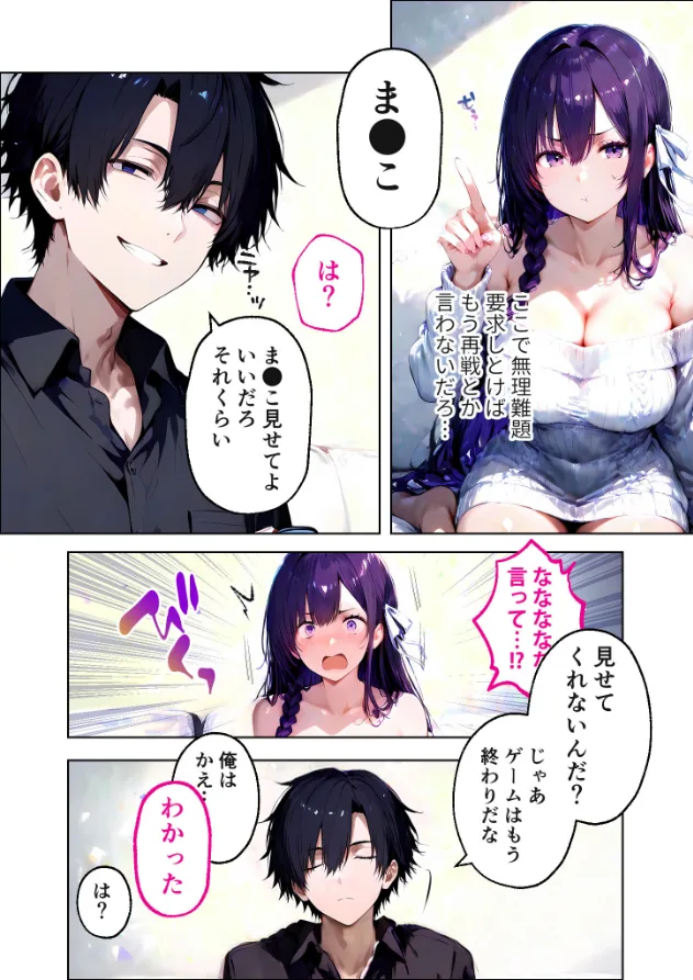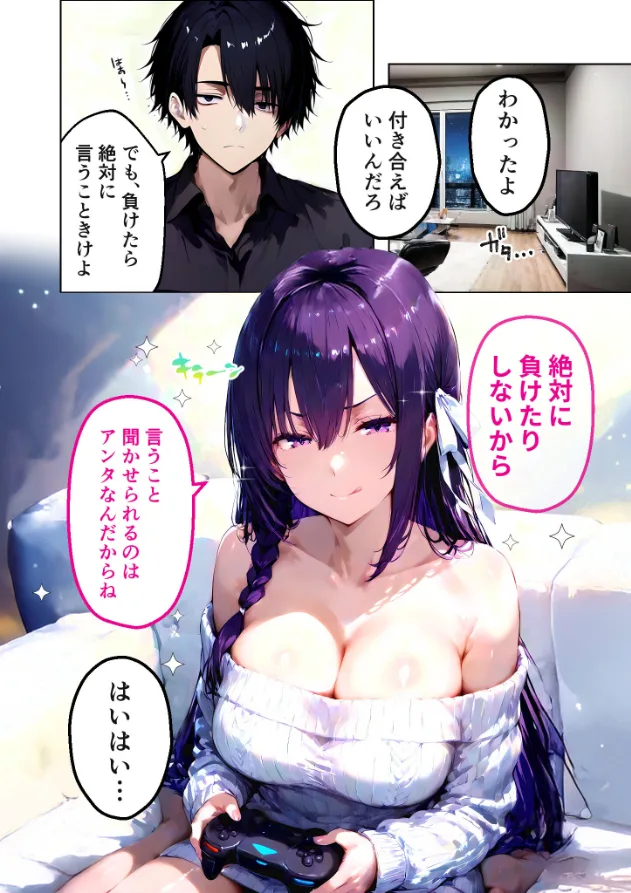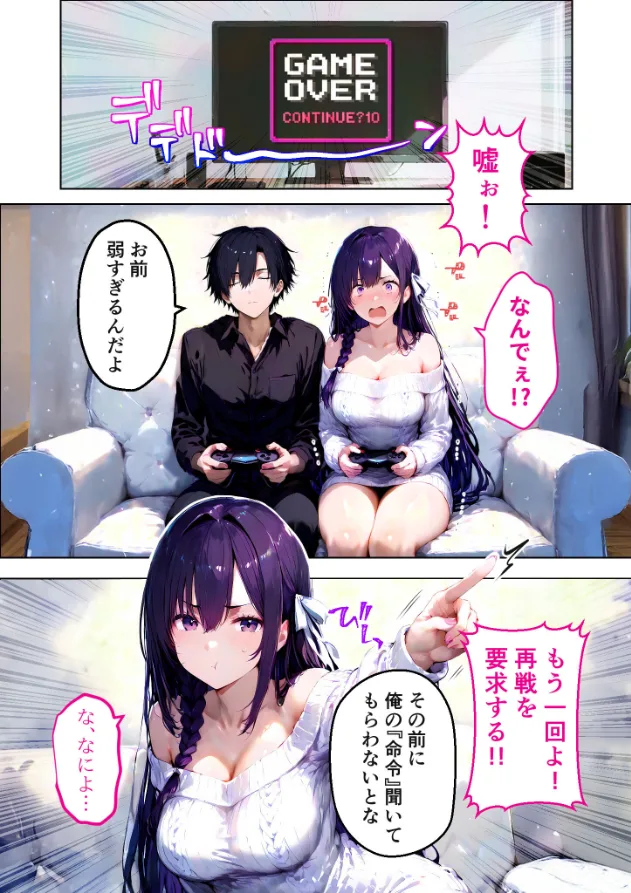 『GAMEOVER』 「嘘ぉ!また負けぇ!?なんでぇ!?」 こいつは同期で幼馴染のマリ。 会社では品行方正・才色兼備でふわふわ女子と言われているが…実際は根っからのゲーム廃人だ。 しかしゲームの腕は正直下手くそで、こうしていつも俺との対戦ゲームに負けている。 「えー?なんで負けるの?意味わかんない……」 「なぁ、俺もう帰っていいか?飽きてきたわ」 「えっダメ!私が勝つまでやるの!」 「それ何時間かかるんだよ……ヤだよ、俺はかえ…――」 「じゃあ次に私が負けたら何でも言うこと聞いてあげる」 「……何でも?エロいことでも?」 「……いいよ」 負けず嫌いの彼女から提案された魅力的な条件は、俺を引き止…