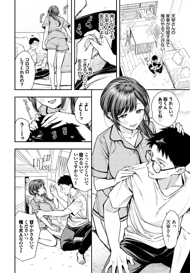 【バブみつよつよお姉さんに甘やかされまくりなイチャえっち♪】 大人気群青エロスコミッカー・蛸田こぬが贈る、年上彼女の愛情たっぷり赤ちゃんプレイ! 家庭的な彼女・天寧と同棲している聡。ご飯やお弁当を毎日作ってくれてお風呂で背中まで流してくれる彼女に聡は甘え切っていた。 そんなある時何もしていない現状に、天寧から愛想をつかされないか不安になった聡は天寧の甘やかしを拒否する! 自分も頼られる人間になりたいと伝えると「じゃあ私のお願い聞いてくれる?」と言ってして膝枕をされ「聡君は今から赤ちゃんになって!」と授乳手コキが始まって…!? とことん母性に包まれる大興奮の甘々SEX!