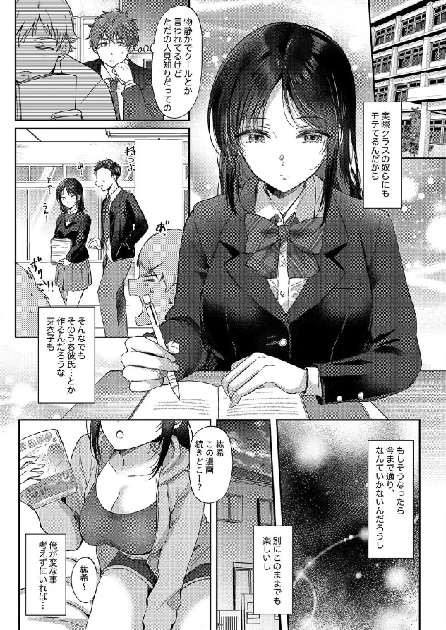 美人で物静かで勉強もできるクラスメイトの芽衣子は、幼馴染の紘希の前だけではリラックスした姿をしている。今日も自室に遊びに来て、薄着で寛ぐ芽衣子の身体に、うっかり視線が行ってしまう紘希。指摘され恥ずかしくて真っ赤になる紘希だったが、芽衣子は意外にも「他人のカラダ気になるのわかるから、触ってみる?」と言い出して…!?好奇心のままに互いの体の観察がエスカレートしていき、ついにセックスすることに…。最初、まったく反応なく涼しい顔で受け入れている芽衣子だったが、あるトコロを突くと意外な反応を見せて…!?